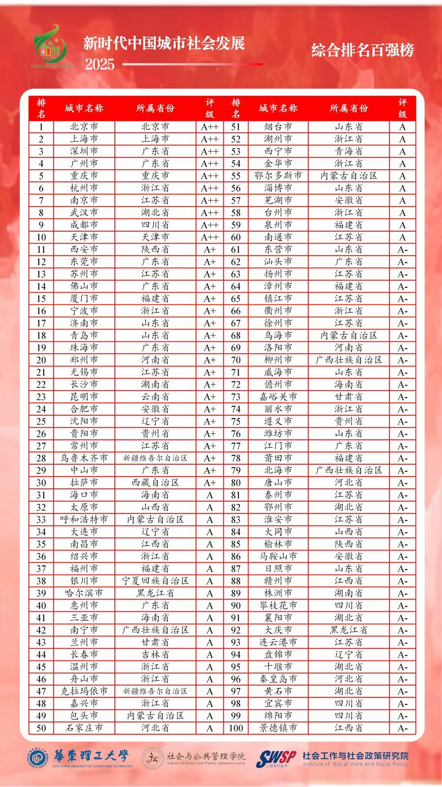 中国城市社会发展百强榜(2025)发布,北上深领跑